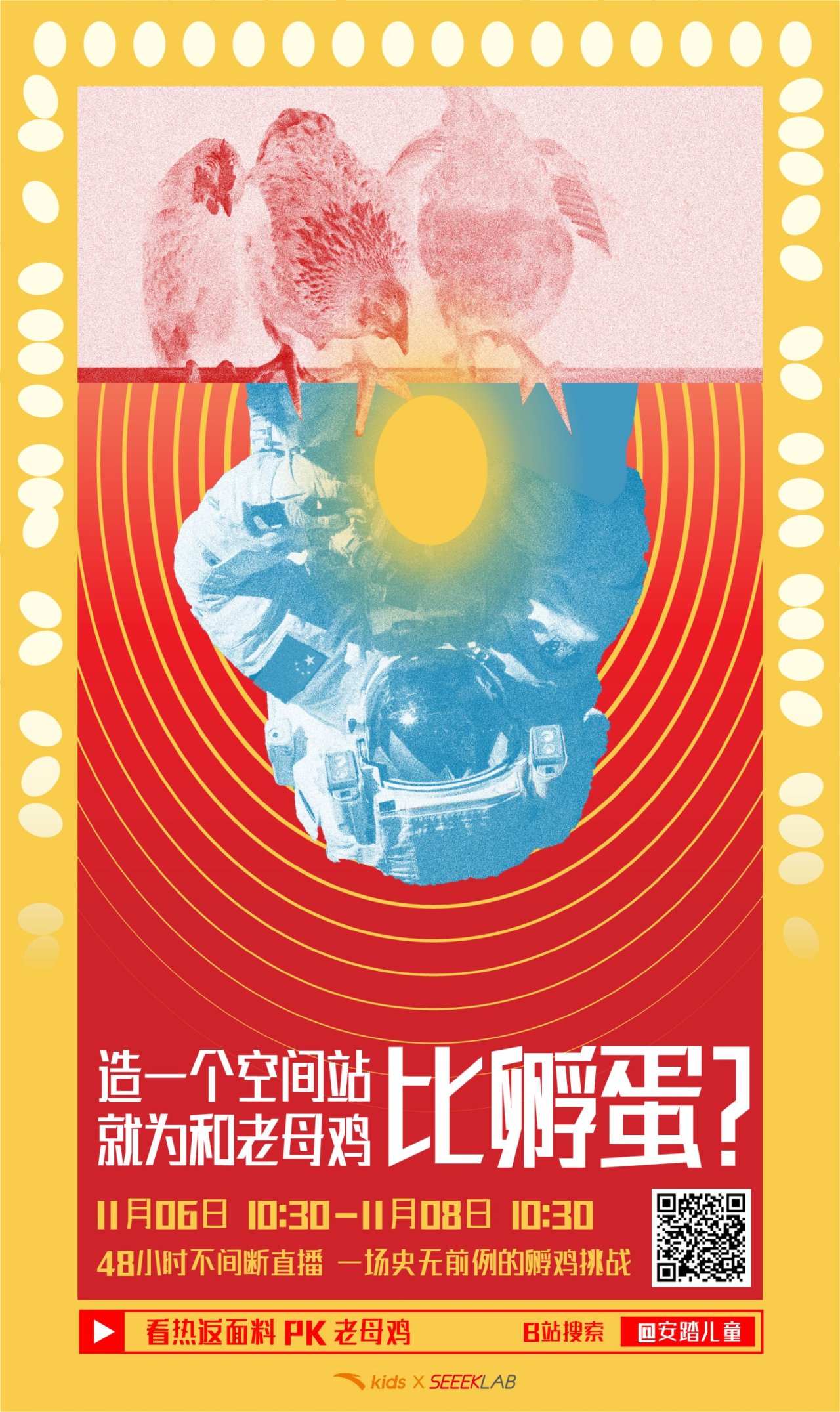 为安踏Kids×中国航天的新品羽绒服发布撰写海报文案。海报围绕主题“暖到能孵鸡”,突出悬念感,引发观众好奇心。